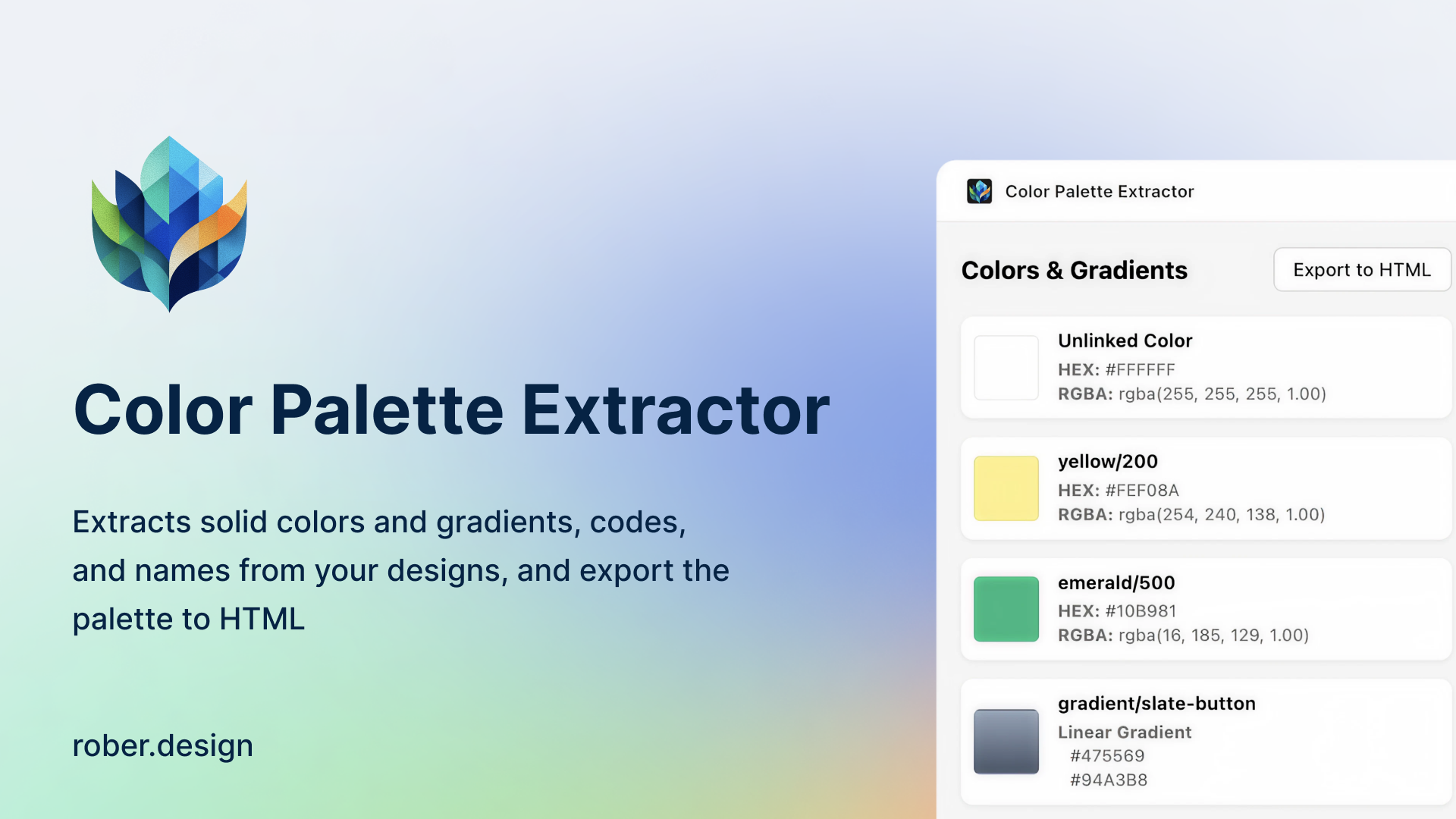 Figma plugin to audit and document color palettes. Scans any selection, extracts all colors and gradients with their Variable or Style name, plus instant access to HEX, RGBA and HSL codes.
